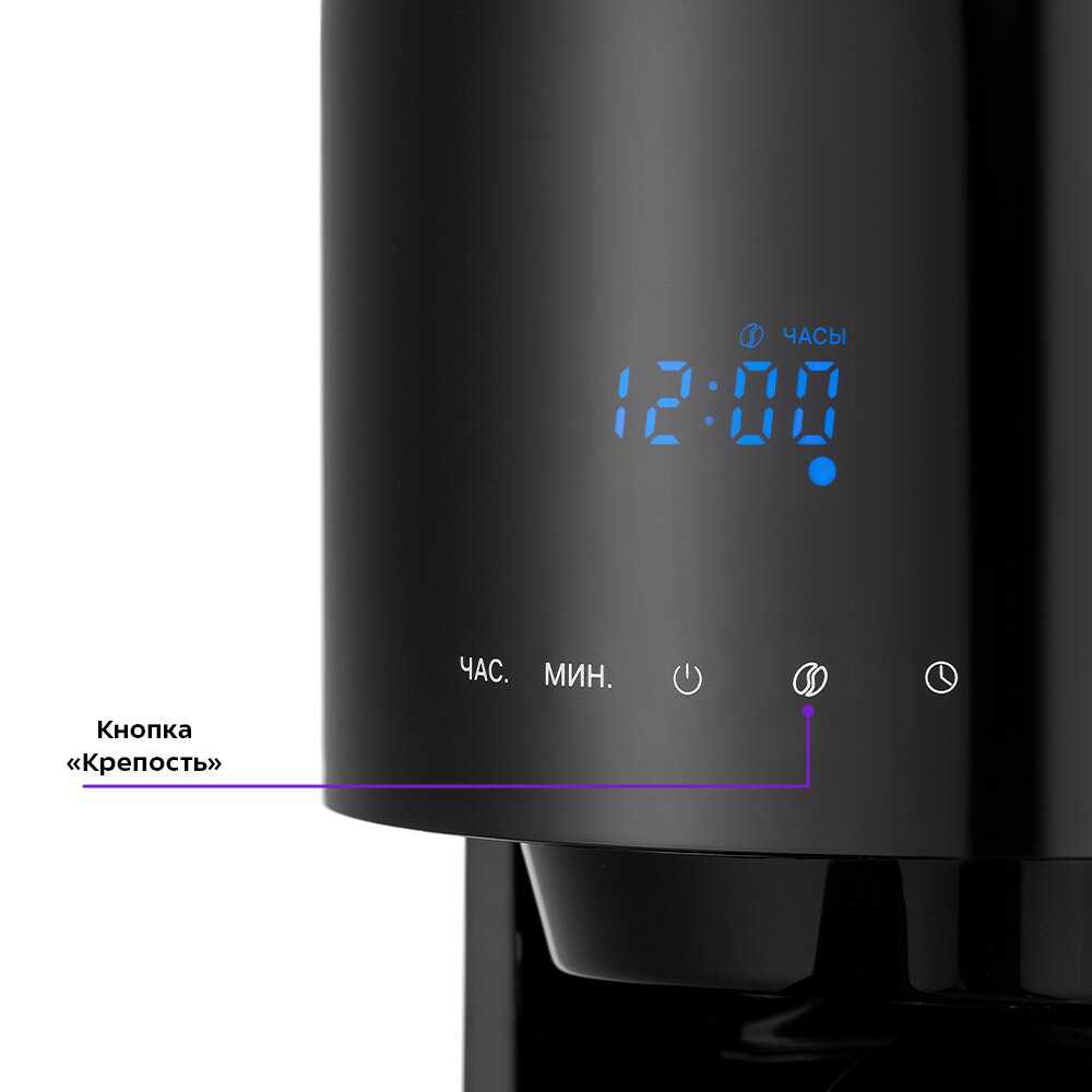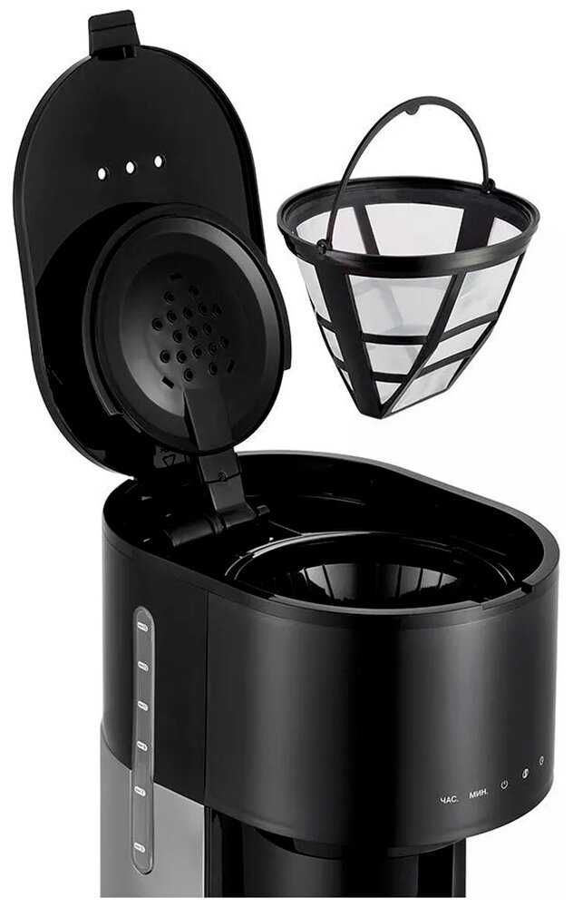 Кофемашина Kitfort KT-7297 — отличный выбор для любителей чёрного кофе. Резервуар для воды на 1,5 л, рассчитан на 10 чашек кофе (по 150 мл). Управление осуществляется с помощью кнопок на панели, а на дисплее отображается выбранный режим и текущее время. Есть функция отложенного старта, также есть противокапельная система. Кофе готовится быстро и получается вкусным и ароматным, фильтр моется быстро и удобно, конструкция надежная.