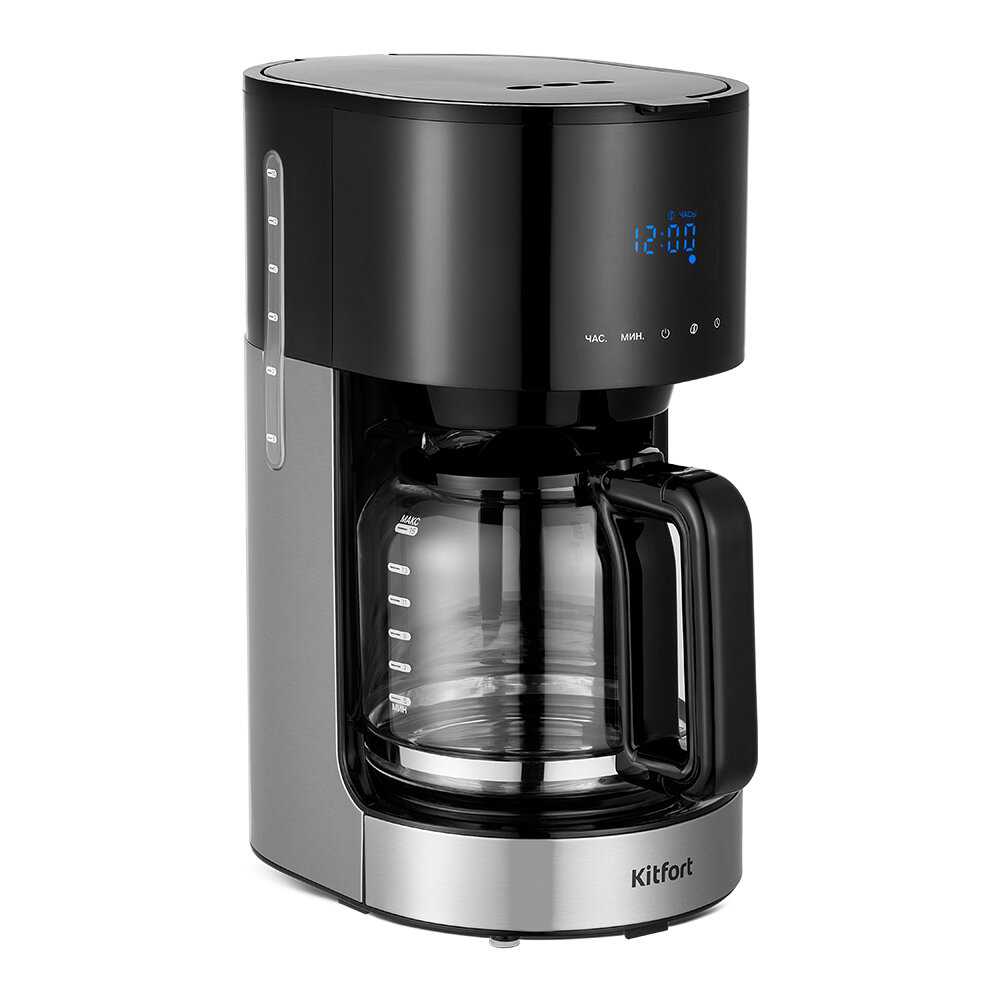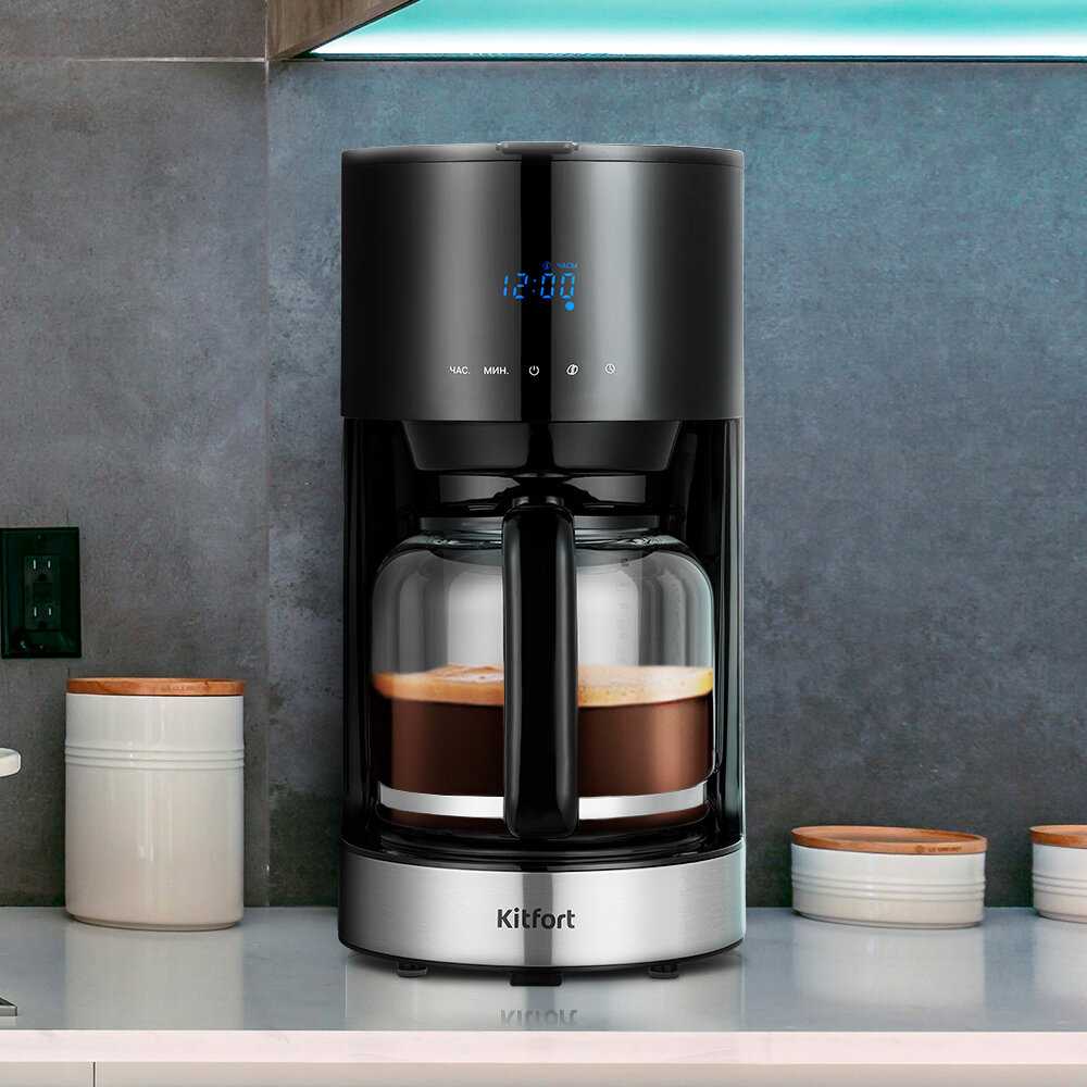 Кофемашина Kitfort KT-7297 — отличный выбор для любителей чёрного кофе. Резервуар для воды на 1,5 л, рассчитан на 10 чашек кофе (по 150 мл). Управление осуществляется с помощью кнопок на панели, а на дисплее отображается выбранный режим и текущее время. Есть функция отложенного старта, также есть противокапельная система. Кофе готовится быстро и получается вкусным и ароматным, фильтр моется быстро и удобно, конструкция надежная.