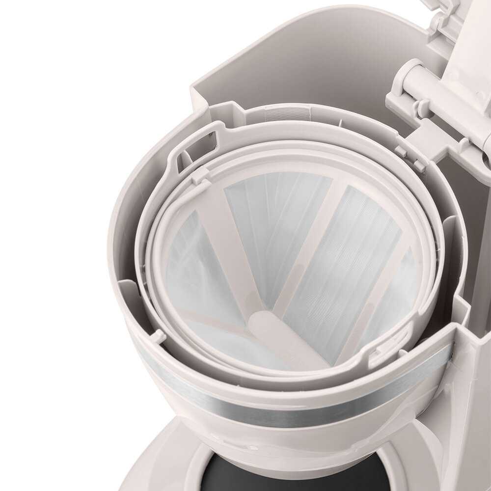 - + Кофеварка красивая, серо-бежевого цвета, понятна и удобна в использовании. Имеет многоразовый нейлоновый фильтр. Дисплей с подсветкой, где можно выставить текущее время. Варить кофе можно сразу, а можно установить отложенный старт, вечером засыпать кофе и налить воду, утром к назначенному времени получить ароматный напиток.