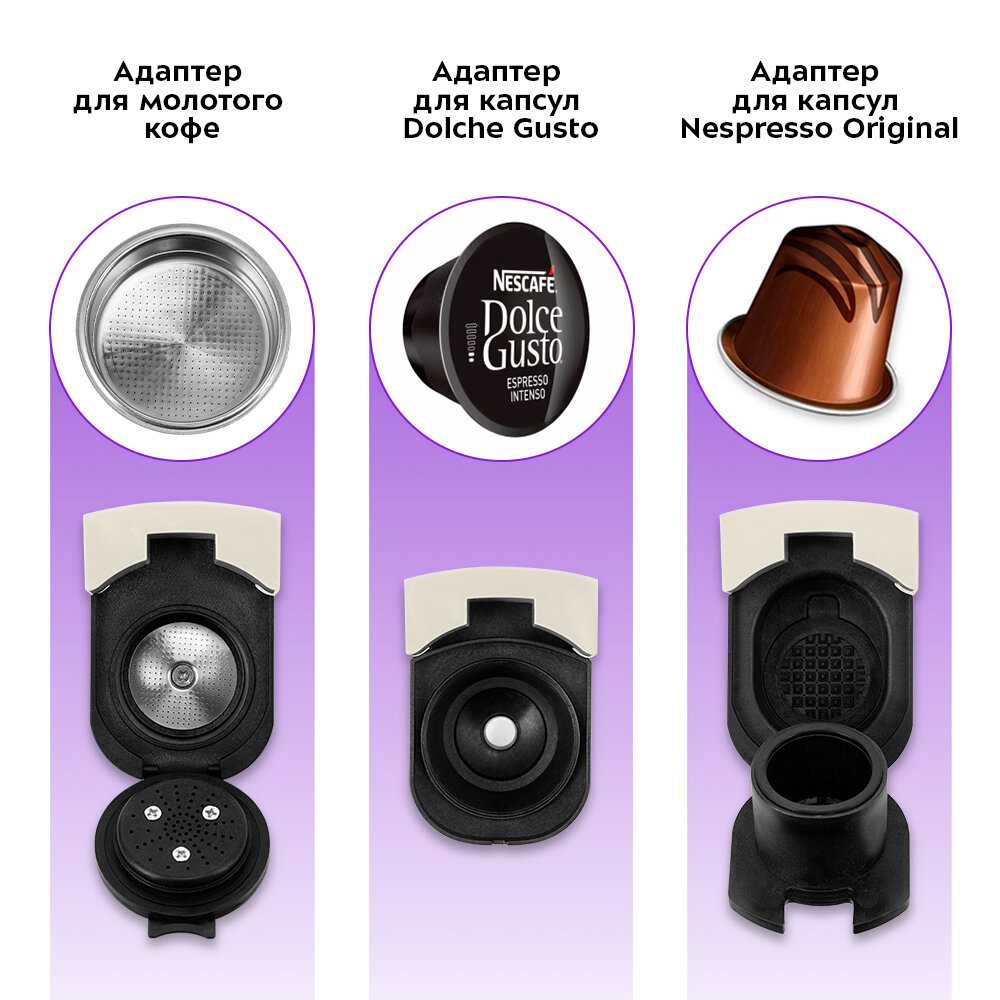 - + Горячий кофе, полная чашка, совместимость с двумя видами капсул+молотый