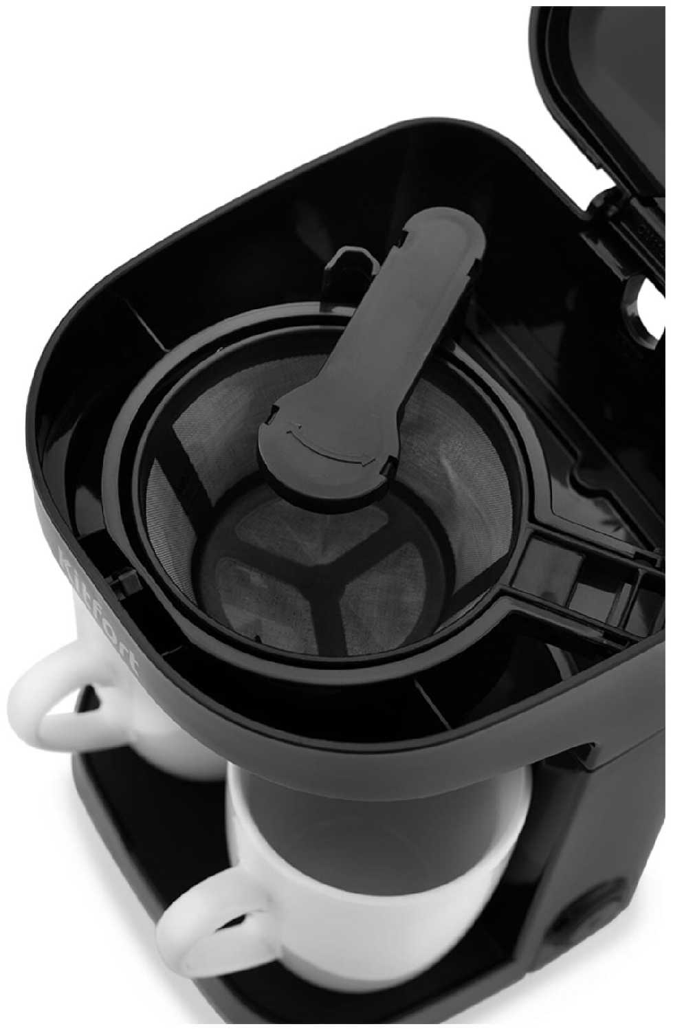 - Габариты кофеварки (чуть больше пачки кофе 250 г) позволяют разместить её даже на маленькой кухне или в офисе. Глубина платформы (7 см) и расстояние между форсунками (5 см) обеспечивают возможность использования как двух маленьких чашек из комплекта, так и одной высокой кружки до 10 см.