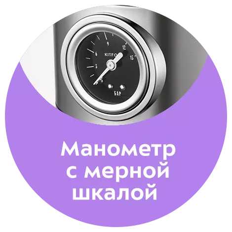 Манометр отображает давление во время экстракции кофе. Нормальный диапазон — 9–12 бар. Если стрелка поднимается выше, это сигнализирует о слишком мелком помоле или чрезмерной утрамбовке кофе. Давление ниже 9 бар говорит о недостаточной плотности таблетки или крупном помоле. Индикатор помогает корректировать процесс для идеального результата. -
