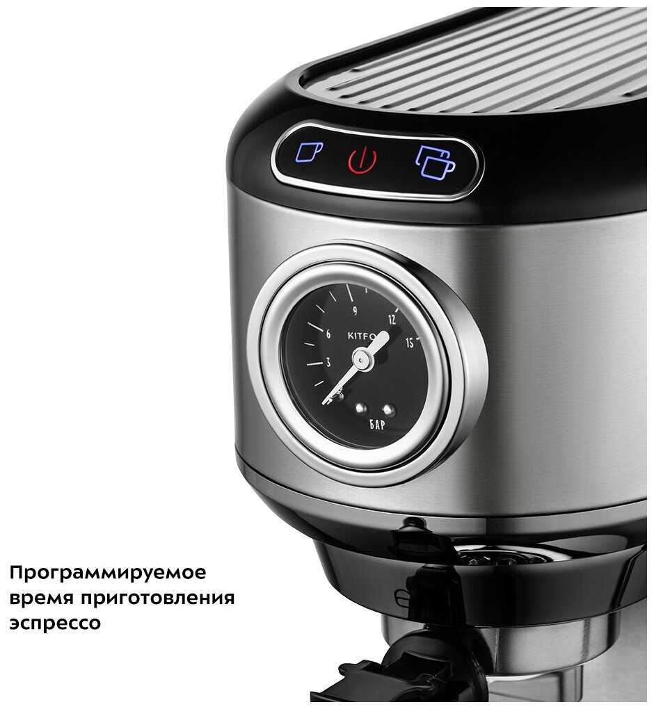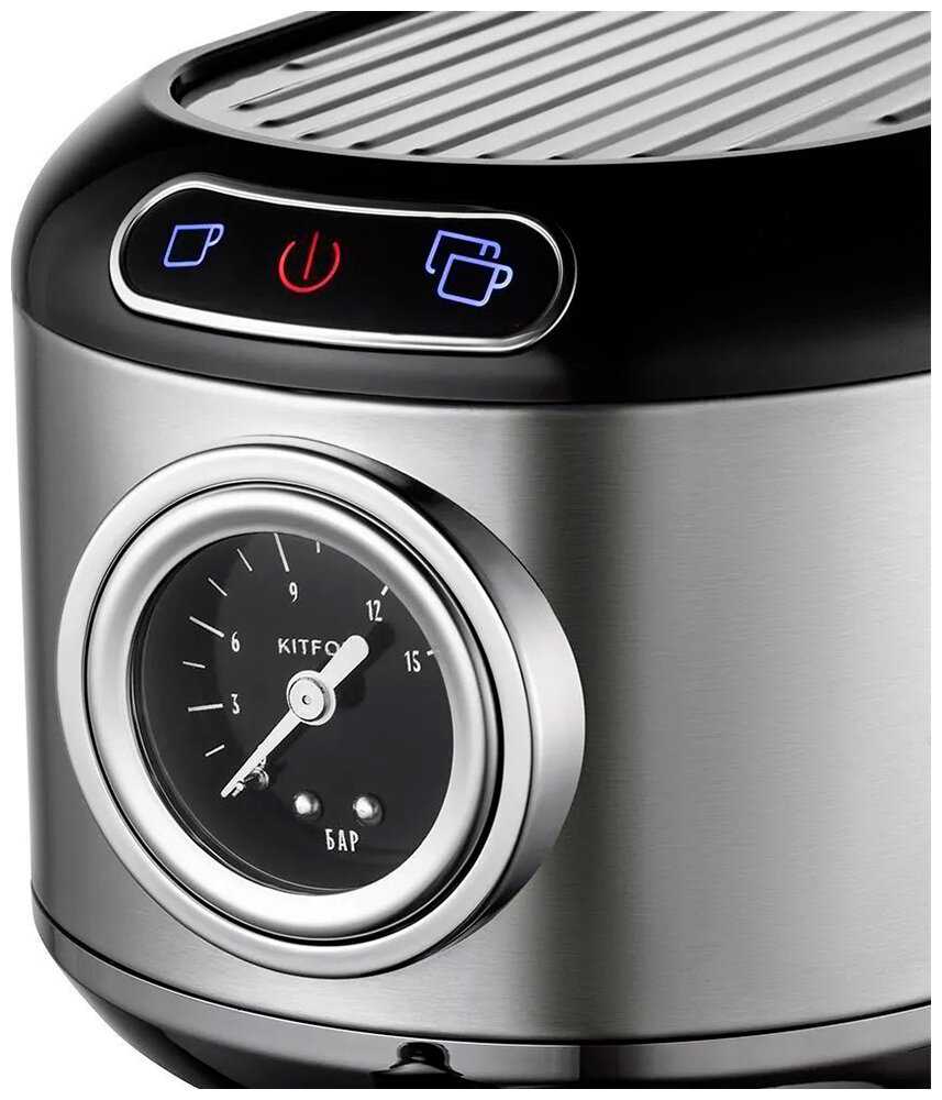 Ключевой параметр — давление 15 бар, обеспечивающее оптимальную экстракцию. Однако реальное рабочее давление, отображаемое манометром, варьируется от 9 до 12 бар. Также важны объём резервуара (1.1 л), мощность (1450 Вт) и наличие двух фильтров — для одной и двух порций. -