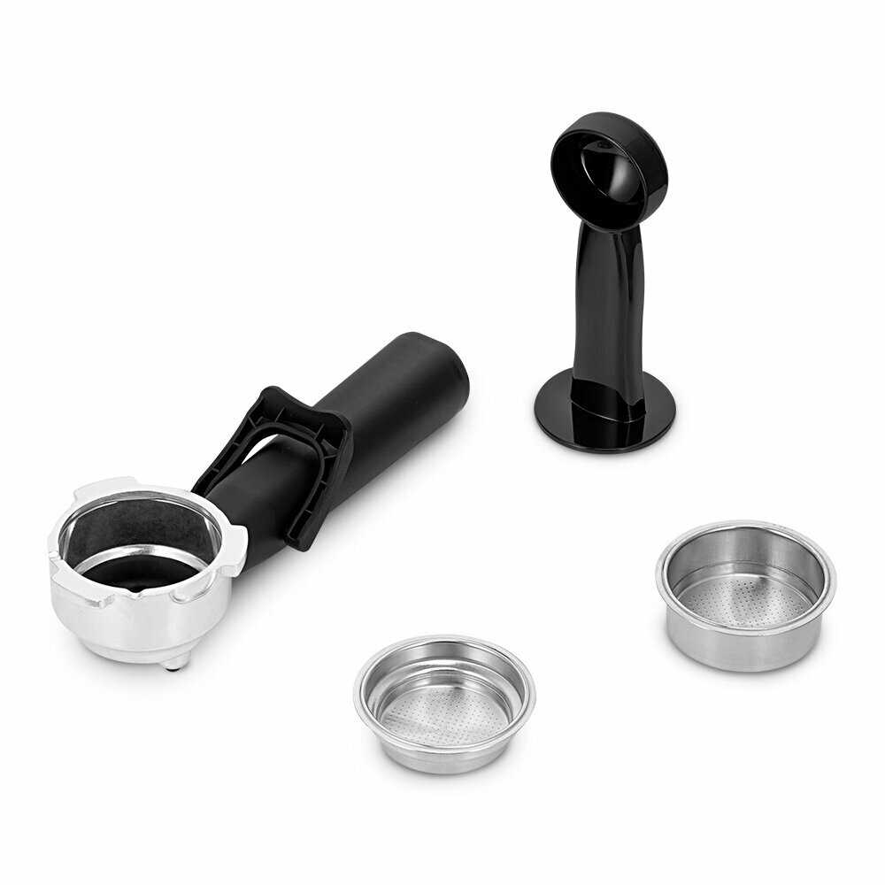 В комплекте идет 2 фильтра для рожка (на одинарный и двойной эспрессо) и темпер с ложкой. Темпер можно сразу заменить, т.к. он очень легкий - пластиковый.