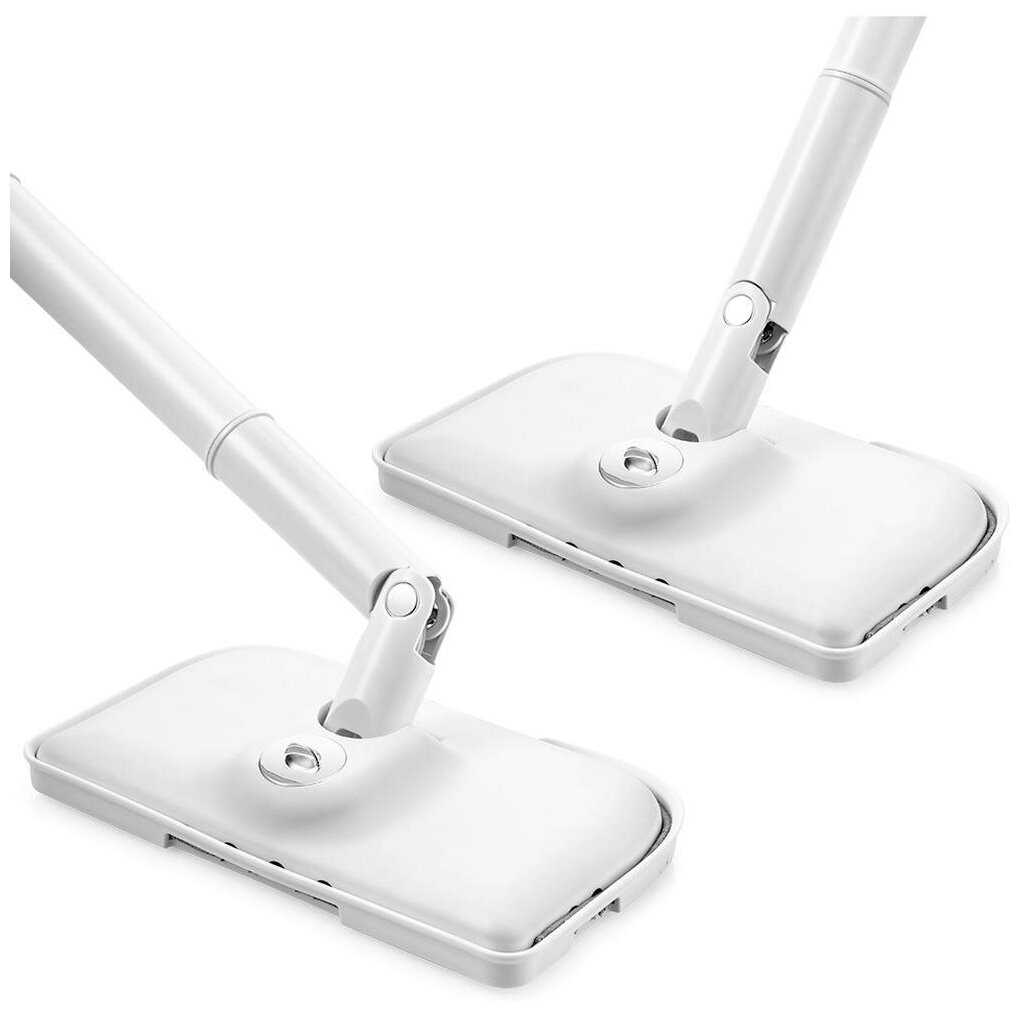 Швабра маневренно проходит под диванами и в узкие углы благодаря поворотной насадке на 180°. Для вертикальных поверхностей (швы плитки, окна, гарнитуры) удобен плечевой ремень из комплекта, но при длительной работе руки устают из-за веса устройства (2.5-3 кг с водой). -