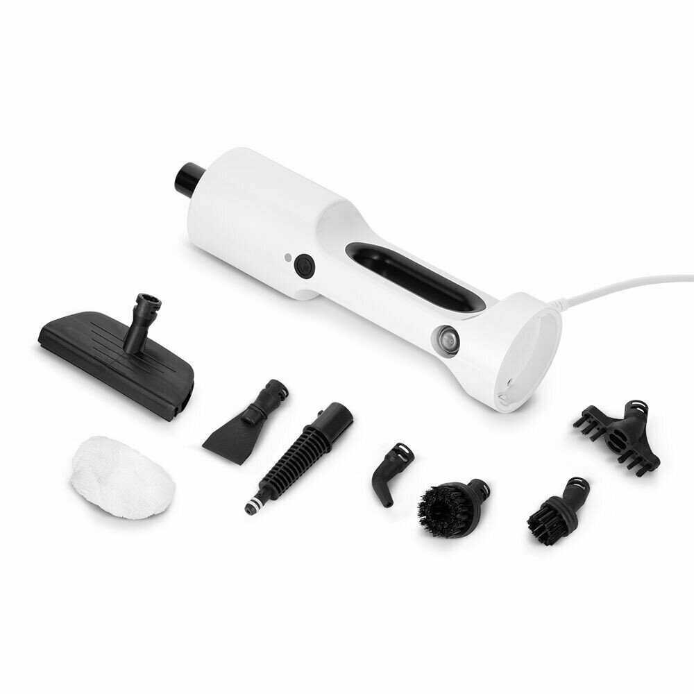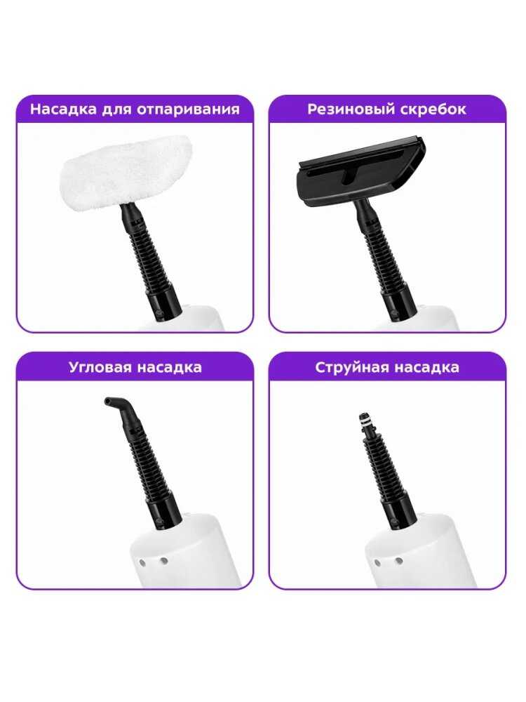 В набор входят насадки для пола, окон, мебели и труднодоступных мест, позволяя использовать устройство как швабру и ручной пароочиститель. Дополнительная тряпка в комплекте исключает необходимость срочной покупки расходников. Однако крепление на липучках может ненадёжно фиксировать ткань, вызывая заворачивание краёв. -