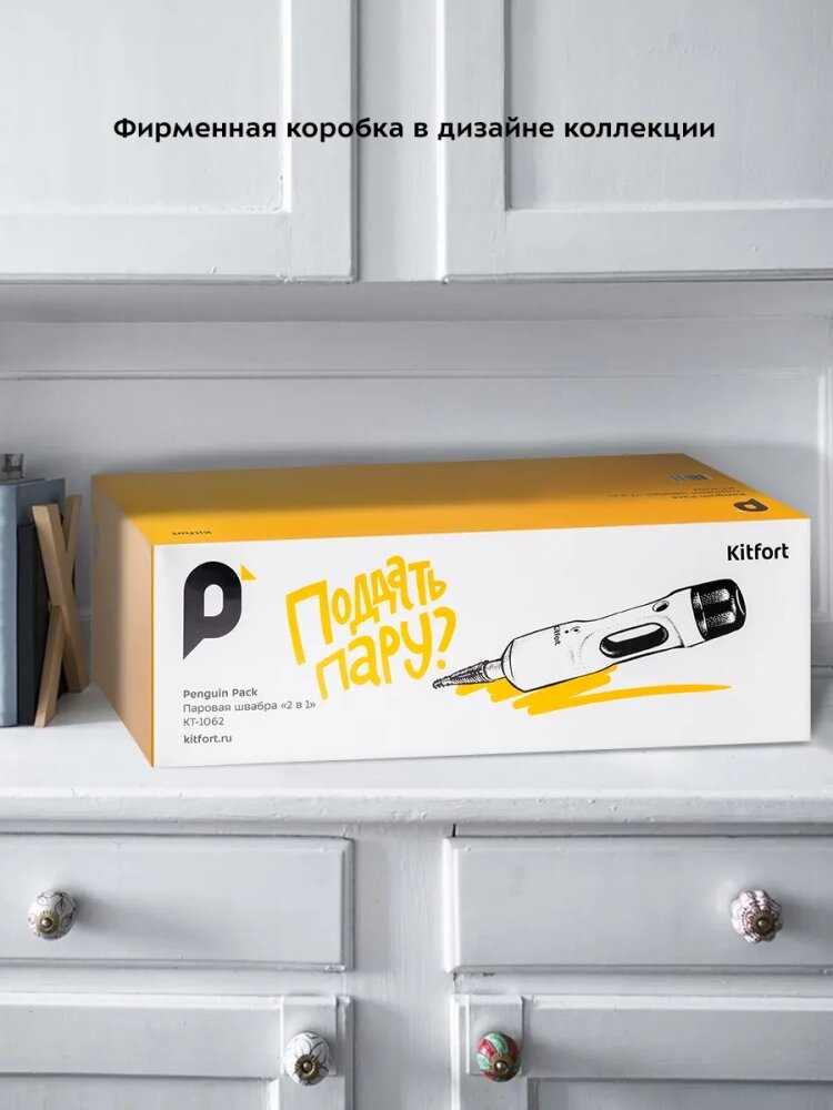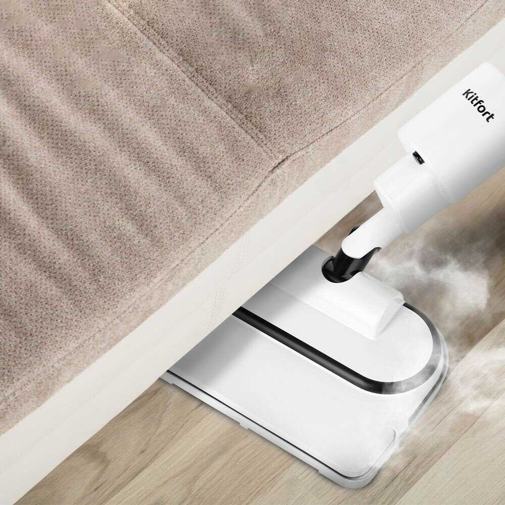 - + Паровая швабра Kitfort KT-1062 легкая, маневренная, имеет широкую насадку для уборки пола, что сокращает время. Быстро нагревается, готова к работе через 15-20 секунд. Имеет множество насадок под разные задачи. Есть два варианта подачи пара.