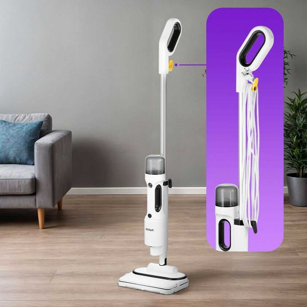 3. Компактность и удобство. Швабра легкая, маневренная и не занимает много места при хранении. Шнур достаточно длинный, что позволяет убирать без постоянного переключения розетки.