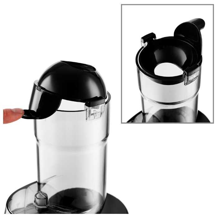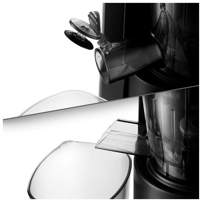 5. Компактная и малошумная - - На соковыжималке есть элементы глянцевого чёрного такая поверхность, конечно, более маркая, чем матовая. Но для меня это спорный недостаток, поэтому пишу для тех, кому это важно. В остальном меня всё устраивает