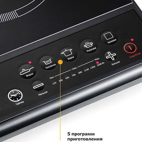 Таймер позволяет устанавливать время приготовления от 1 минуты до 120 минут, по истечении которого плита автоматически отключается и подает звуковой сигнал. Пользователи высоко оценивают эту функцию для варки яиц, каш и макарон, что исключает риск переваривания. Смена установленного времени и мощности происходит моментально, обеспечивая точный контроль над процессом готовки. -