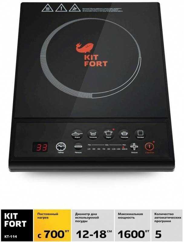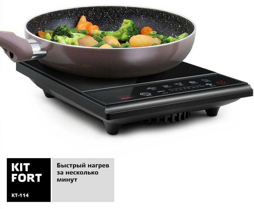 - + Купили на днях индукционную плитку Kitfort KT-114. Стоит отметить, что 1) вентиляторы работают очень тихо, не гремят и не раздражают. 2) Нагревает посуду моментально, что поразительно бросается в глаза после использования чугунной плитки, которая сначала нагревает себя, а уже потом посуду. КПД у индукционной плитки 90%. Есть несколько основных режимов: Базовый, Варка, Жарка, Разогрев и Томление. Можно изменять мощность в большую или меньшую сторону от 120 до 1600 Вт, а также есть таймер, который помогает следить за тем, сколько уже готовится блюдо.