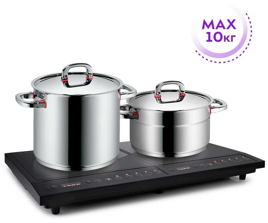 Диаметр зон нагрева — 16,5-20 см, что подходит для посуды объемом до 5,5 литров. Пользователи успешно используют широкие сковороды, но отмечают, что посуда может скользить по гладкой поверхности при перемешивании. -