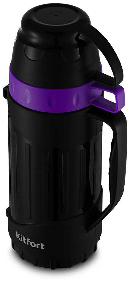 Две кружки-крышки разного объёма (чёрная и фиолетовая) позволяют заваривать напиток в одной и кашу в другой, идеально для двоих в лесу или поездке. Разбирается полностью для мытья, пластиковый корпус с ручкой облегчает переноску 1 л жидкости без усталости рук. Лёгкий вес (замечается даже с литром чая) и эргономика хвалятся семьями и спортсменами для прогулок. Кружки накручиваются по резьбе без проблем, пластик без запаха после проветривания.