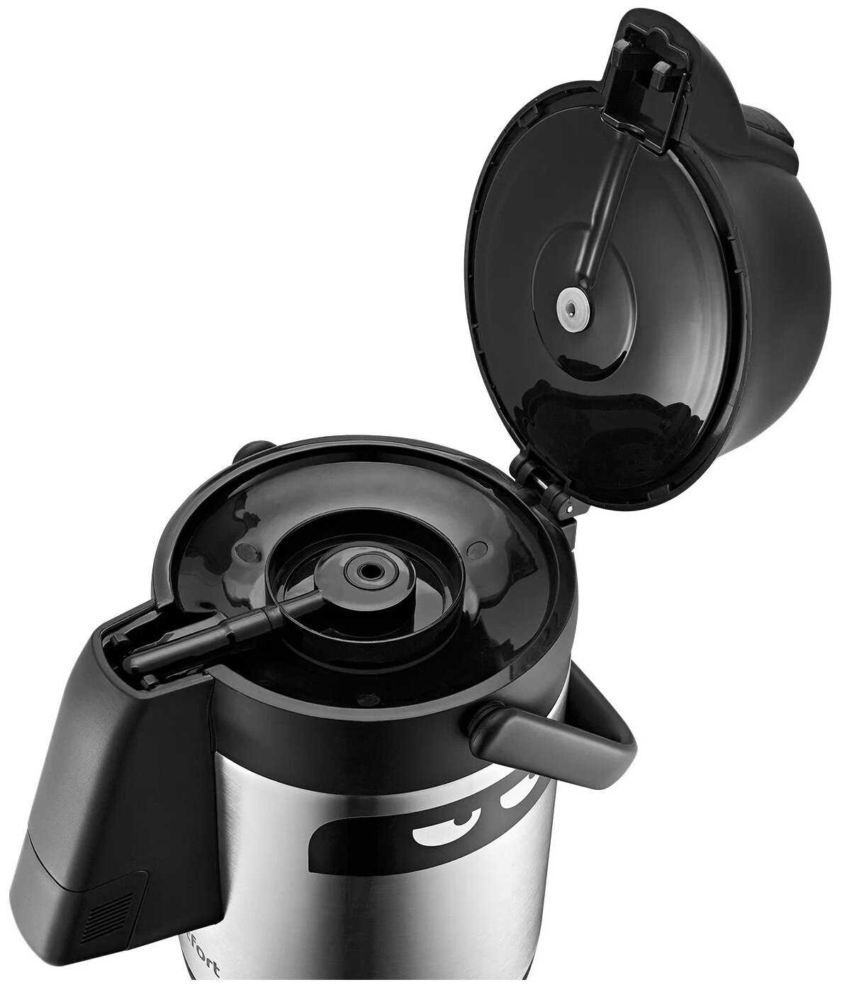 - + Большой объём, хорошо держит тепло. Удобный тип конструкции для такого объёма, не приходится поднимать его чтобы налить содержимое.