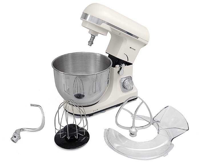 Во-вторых, удобство использования. Чаша большого объема (5,7 литров!) позволяет готовить сразу много, что очень выручает при подготовке к праздникам или для большой семьи. Набор насадок (венчик, лопатка, крюк) перекрывает все базовые потребности. Легкая смена насадок и простота ухода — отдельный плюс.
