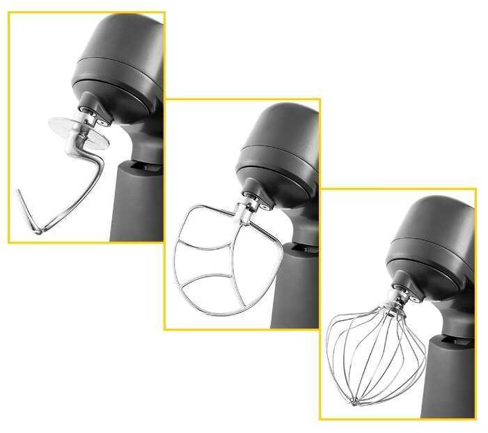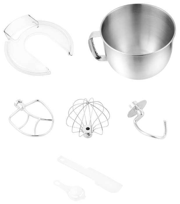 Большой плюс – удобная чаша из нержавеющей стали. Она вместительная, так что можно сразу замесить тесто на большую семью. В комплекте есть несколько насадок, которые позволяют использовать миксер не только для выпечки, но и для взбивания белков, приготовления соусов или даже картофельного пюре.