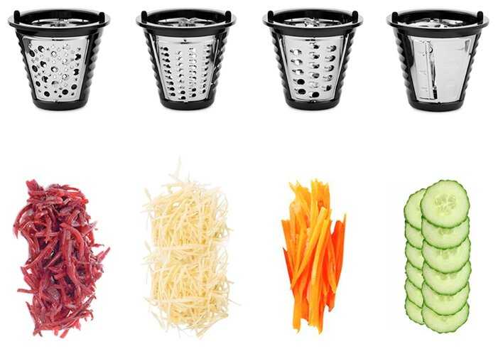 - + Быстрая сборка и смена насадок, шустро все шинкует.