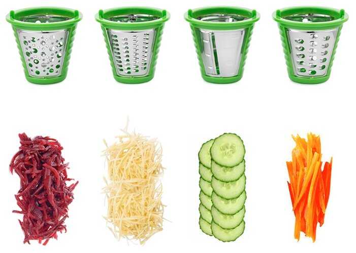 В наборе 4 насадки: шинковка, терка мелкая, терка крупная, терка средняя. Острые лезвия терок (мелкая и крупная) трут очень хорошо - за каких-то 5 минут натерла всю заготовку для салата. Насадка мелкая терка - идеальна для свеклы. Насадка средняя терка - идеально натерла сыр (не раздавила, не накромсала, а именно натерла тоненькими полосками). Насадка крупная терка - идеальна для моркови по-корейски. Насадка шинковка - идеальна для картошки для домашних чипсов, для шинковки капусты.