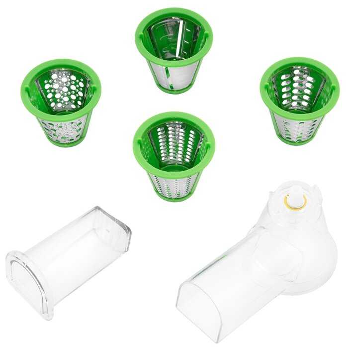 В наборе 4 насадки: шинковка, терка мелкая, терка крупная, терка средняя. Острые лезвия терок (мелкая и крупная) трут очень хорошо - за каких-то 5 минут натерла всю заготовку для салата. Насадка мелкая терка - идеальна для свеклы. Насадка средняя терка - идеально натерла сыр (не раздавила, не накромсала, а именно натерла тоненькими полосками). Насадка крупная терка - идеальна для моркови по-корейски. Насадка шинковка - идеальна для картошки для домашних чипсов, для шинковки капусты.