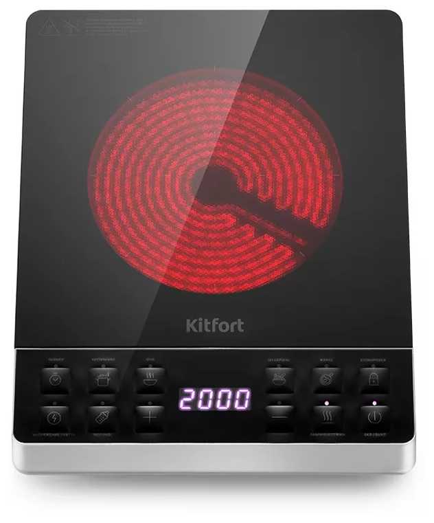 Плита демонстрирует высокую скорость нагрева: литр воды закипает за 2–3 минуты при мощности 1600–2000 Вт, что подтверждается многочисленными тестами пользователей. Регулировка мощности гибкая — с шагом 100 Вт в диапазоне от 100 до 2000 Вт, что позволяет точно настраивать температуру под разные задачи (томление каш, интенсивная жарка). Инфракрасная технология обеспечивает равномерный прогрев посуды, включая чугунные казаны и эмалированные ёмкости до 5 литров. Однако часть пользователей отмечает несоответствие заявленной и реальной мощности: например, в режиме 800 Вт потребление достигает 6.5 А (~1.5 кВт), а при 1200 Вт — 7.6 А (~1.8 кВт).