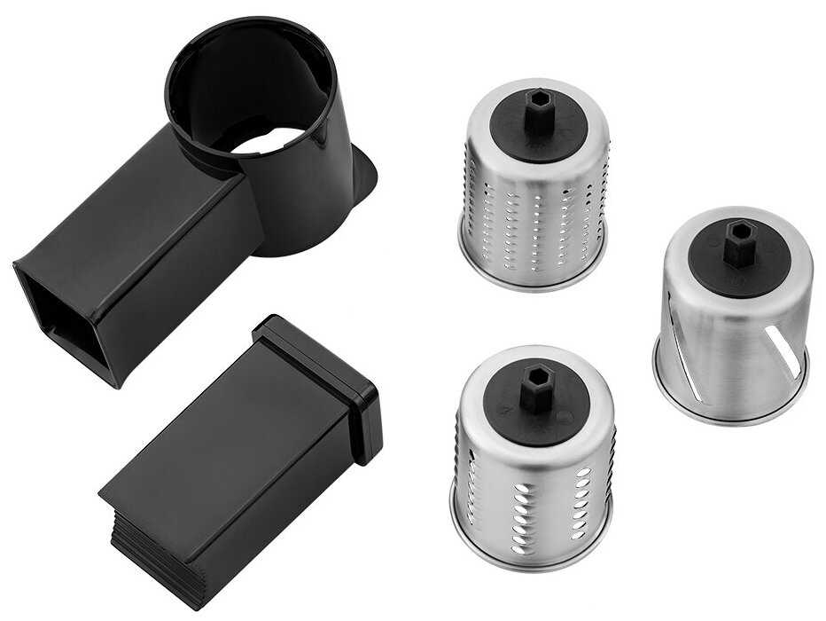 - Три насадки (крупная и мелкая терки, шинковка) покрывают основные нужды: от драников до салатов и икры.