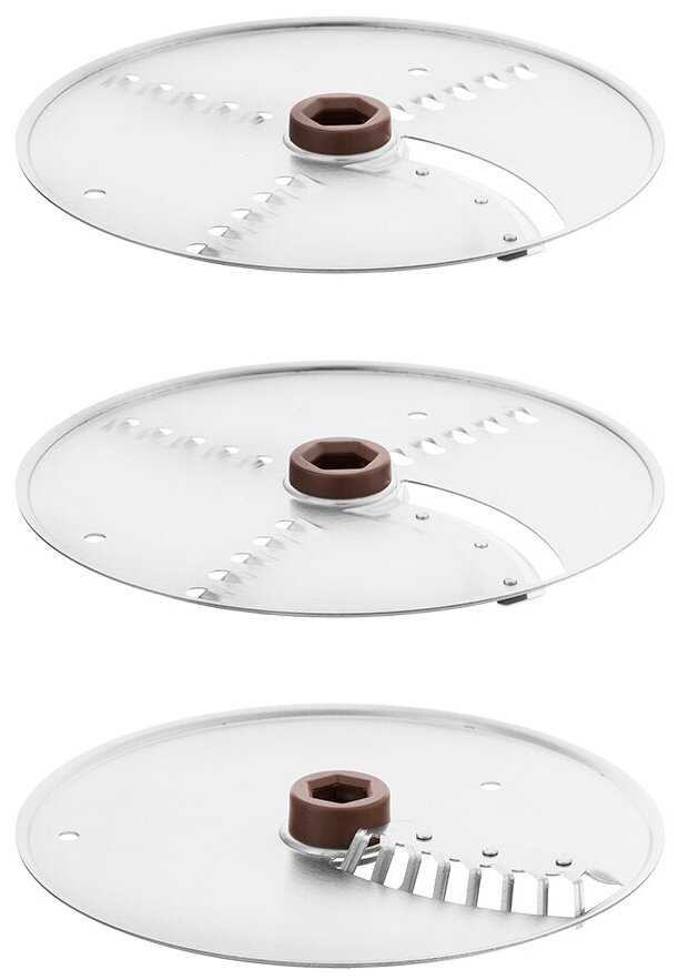 - Три металлических диска дают 5 видов нарезки: мелкая/крупная терка, мелкая/крупная шинковка, соломка для фри.