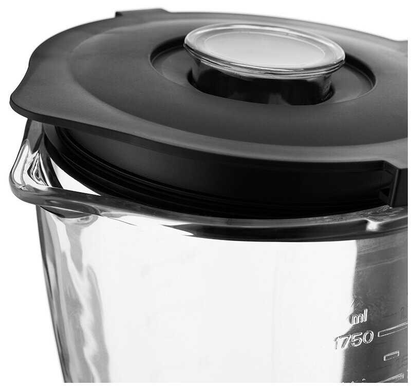 Приятный дизайн, стеклянный стакан внушает надежность в сравнении с пластиковым, оптимальная мощность (600 Вт) и удобный объем емкости (1,75 л.) для приготовления смузи и крем-супа, снизу моторного блока имеются присоски для фиксации, что придает устойчивость блендеру во время рабочего режима. 5 позиций скоростного режима, но достаточно мощно и быстро на 2-ой позиции измельчился лимон, сельдерей, шпинат, огурец, укроп (правда лимон, сельдерей и огурец заранее нарезала на кусочки шириной 2см.). В крышке имеется отверстие для дополнительной загрузки и стаканчик-заглушка с мерными делениями, что придает дополнительное удобство при приготовлении.