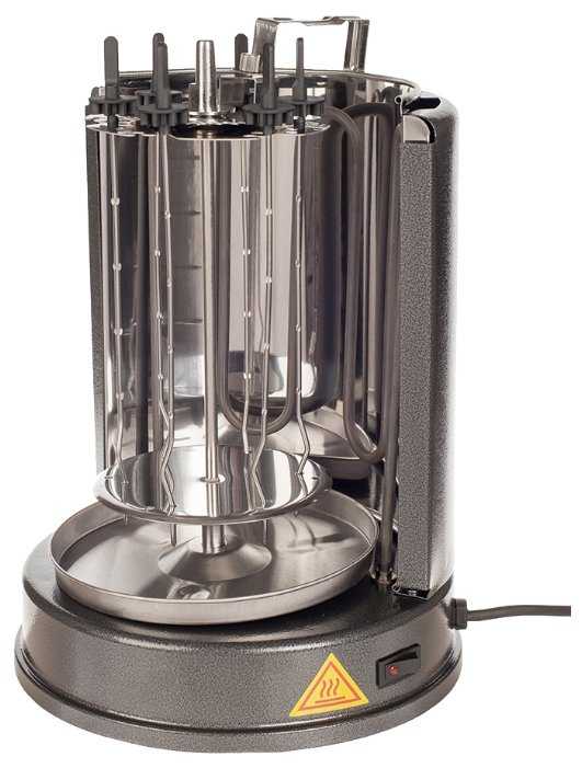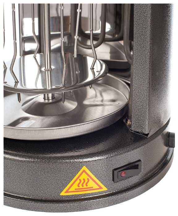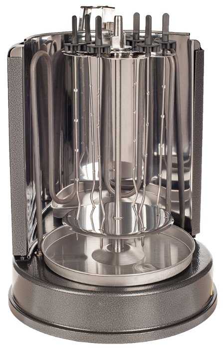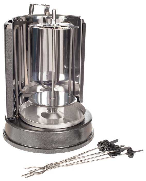 - Шампуры вращаются вокруг центральной оси и вокруг своей оси, что обеспечивает равномерное распределение жара.