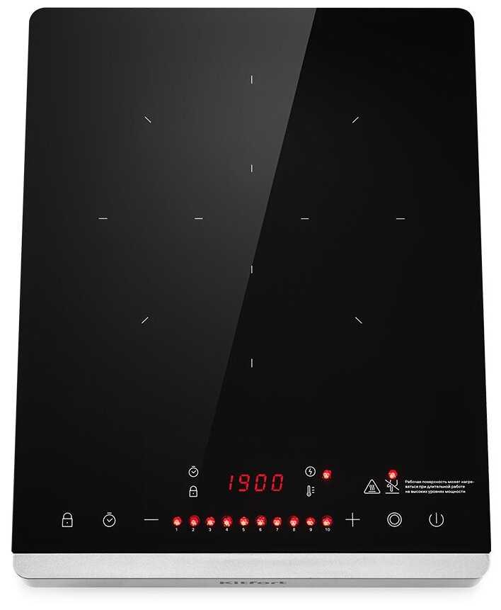 Воздух над плитой ощутимо теплеет, но нижняя часть корпуса и столешница остаются холодными благодаря системе обдува. Индикатор нагрева (красный светодиод) предупреждает о горячей поверхности даже после выключения. Это исключает ожоги при случайном касании. -