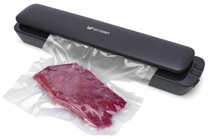 Купила недавно вакууматор Kitfort 1503. У него есть как и минусы, так и плюсы. Вакуумирует быстро и качественно, видно, что воздух полностью удаляется, еще и объемные продукты очень хорошо вакуумирует, но желательно на таких пакетах делать двойной шов. Достаточно простой в использовании, управляется двумя кнопками. Занимает немного места на кухне, что очень удобно. В комплекте идут пакеты, что тоже порадовало.