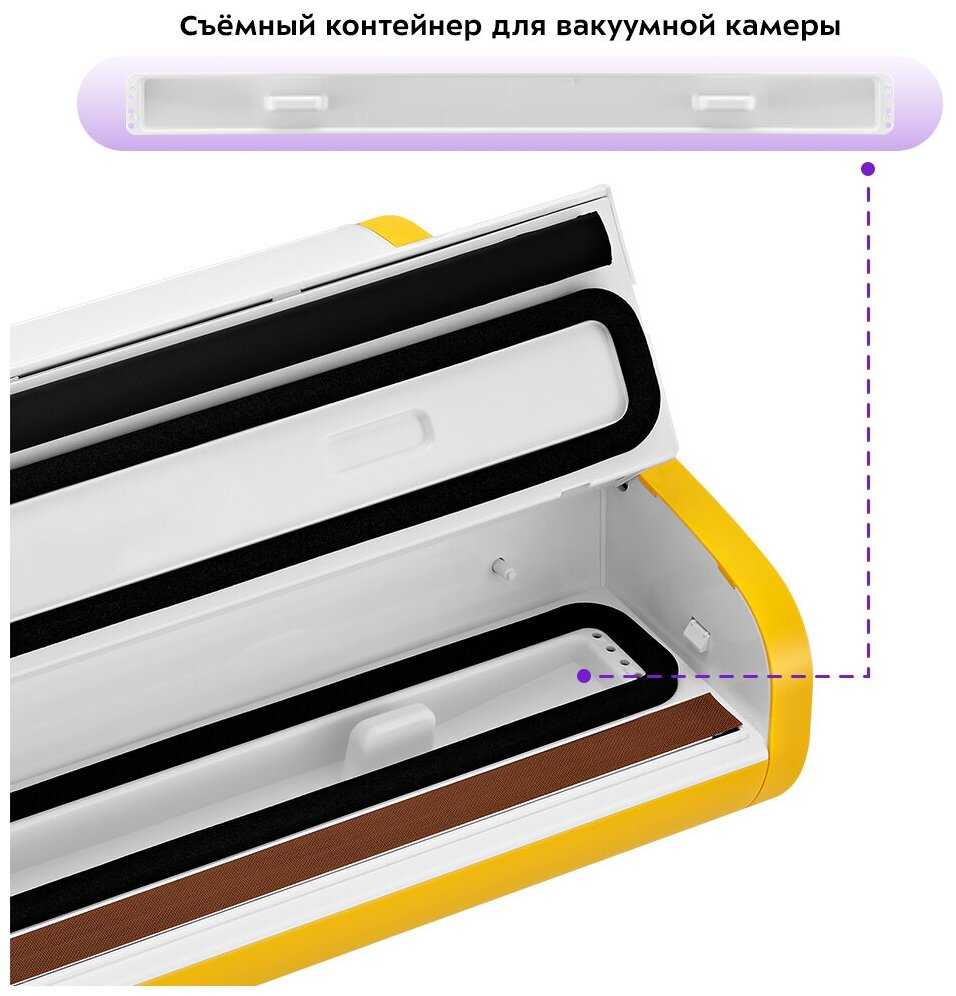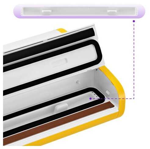 Дополнительная информация : | При вакуумировании влажных продуктов, внутрь камеры может попасть жидкость и остатки пищи. Для таких случаев там установлен съёмный контейнер. |