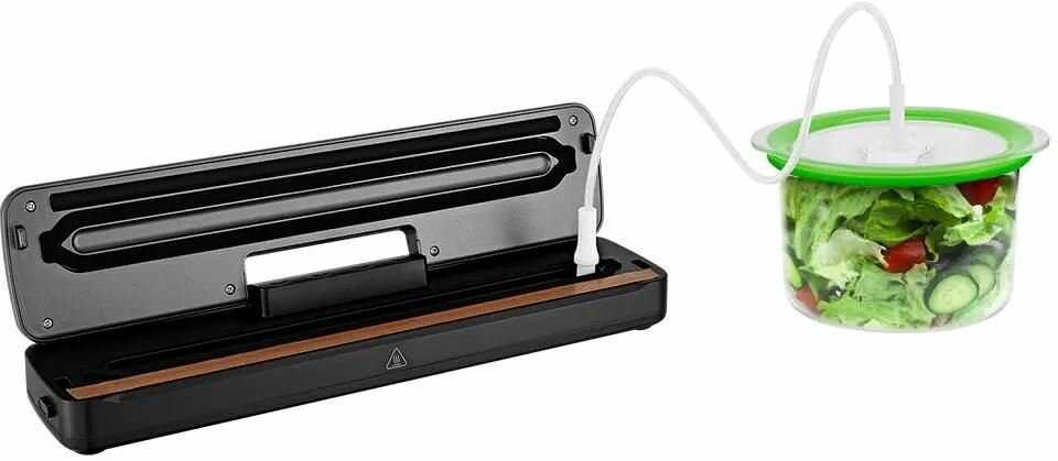 - Вакуумная трубка диаметром 6 мм позволяет откачивать воздух из специализированных контейнеров, сохраняя готовые блюда (салаты, нарезки) без деформации.