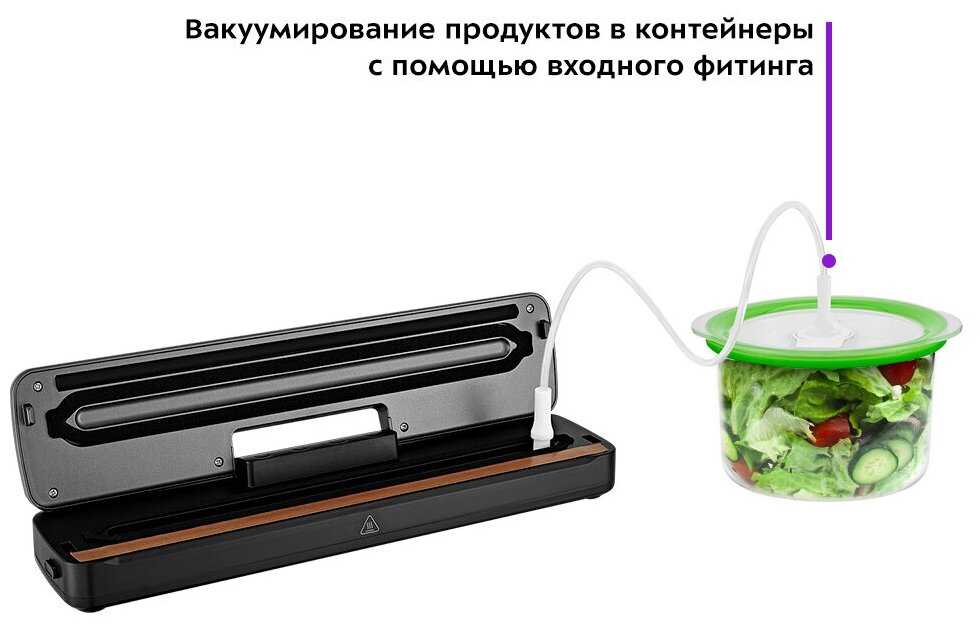 Функционал: позволяет вакуумировать не только твердые, но и более «мягкие и влажные» продукты, которые менее подходят для вакуумации (пример: маринованные оливки). Режим переключается легко и удобно - специальной кнопкой на корпусе. Так же в комплекте присутствует специальная трубка для откачивания воздуха из специальных контейнеров, что позволяет вакуумировать даже уже готовое блюдо.
