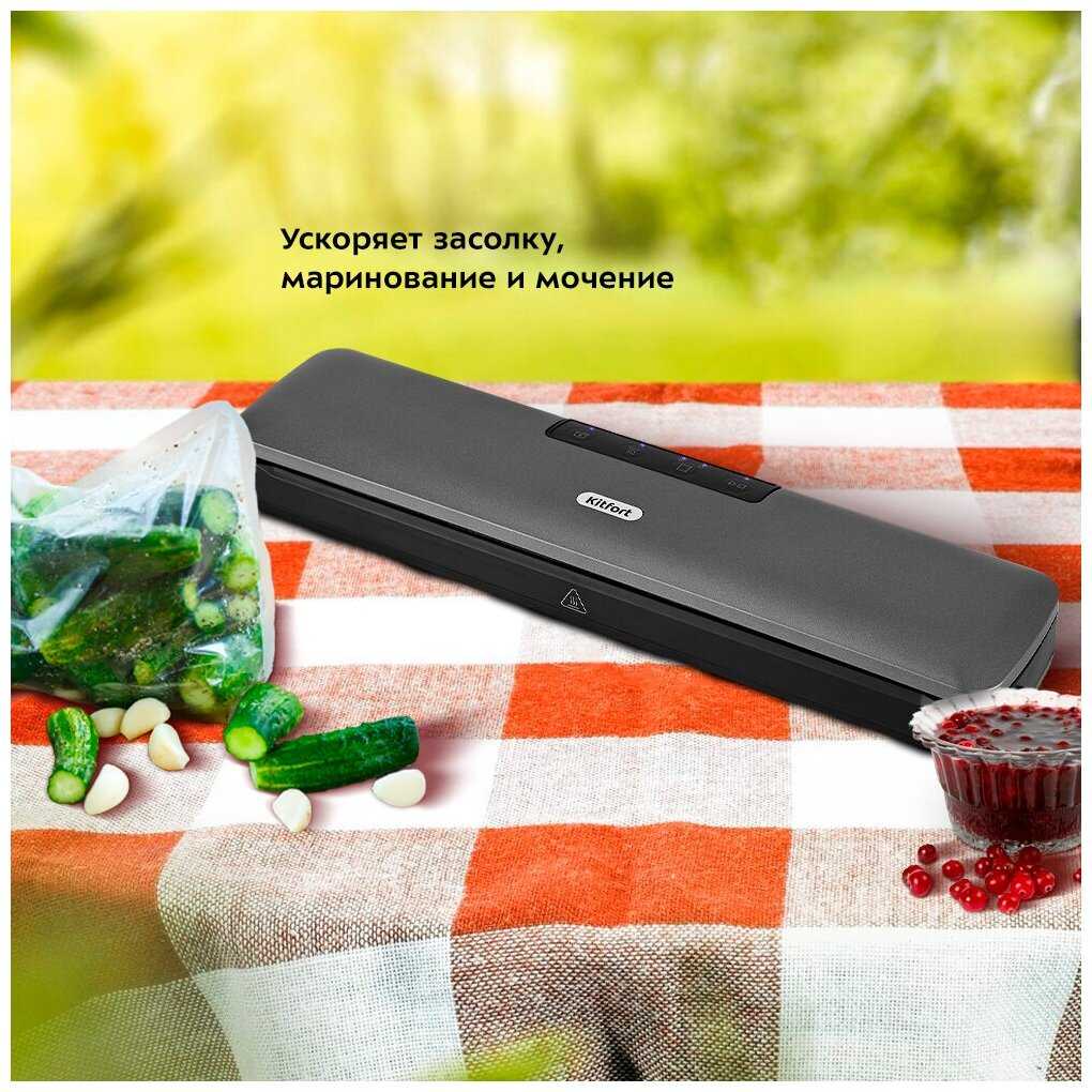 - Режим "влажная упаковка" предотвращает всасывание жидкости в механизм, позволяя вакуумировать маринованные продукты (оливки, курицу в соусе) без протечек.