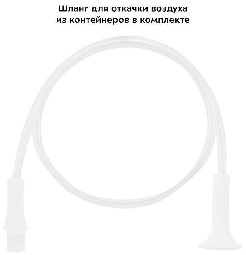 В комплекте поставляется гибкий шланг длиной 15 см, совместимый с клапанными крышками контейнеров (не входят в комплект). Пользователи отмечают эффективное удаление воздуха, но фитинг требует аккуратного обращения – при резких движениях возможен срыв соединения. Для плотной фиксации рекомендовано прижимать трубку рукой. -
