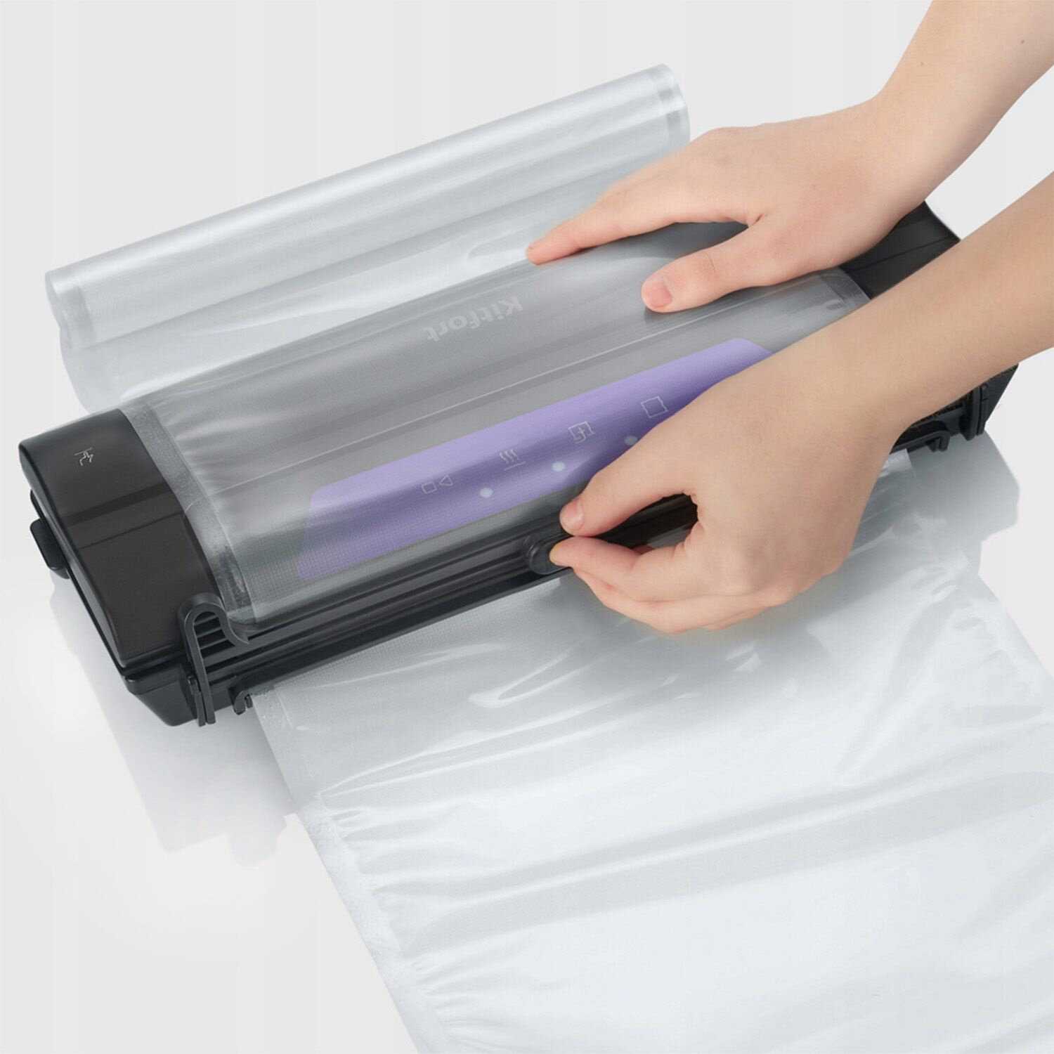 Для работы с рулонной пленкой максимальная длина пакета составляет 28 см, что позволяет упаковывать продукты среднего размера. Функция отдельной запайки крайне удобна при использовании рулонов, так как позволяет создавать пакеты произвольного размера. Многие пользователи приобретают фирменные рулоны Kitfort для достижения оптимального результата. Резак обеспечивает ровный срез пленки, что способствует качественной герметизации шва.