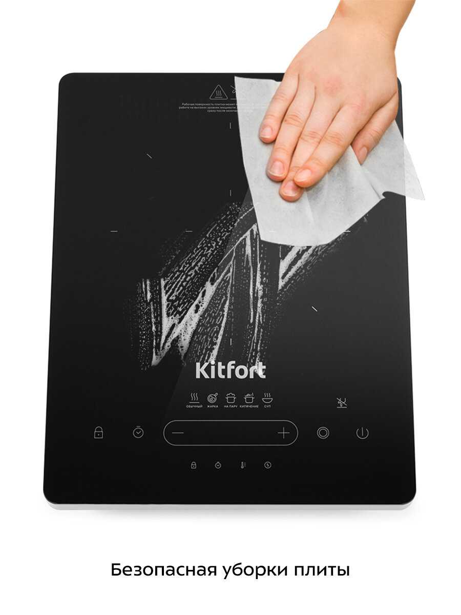 - + Очень красивый внешний вид. Хорошее качество сборки - ничего не скрипит, не люфтит, не шатается, хорошее, толстое стекло. Удобное включение и управление температурой, легко установить нужную температуру, увеличивает по 100. Компактная, занимает не много места. Готовить удобно, помещается большая сковородка или кастрюля. Ничего не пригорает и можно быстро привыкнуть к тому, какую мощность нужно выставить для того или иного блюда. В целом впечатления только положительные, Китфорт как всегда держит хороший уровень качества.