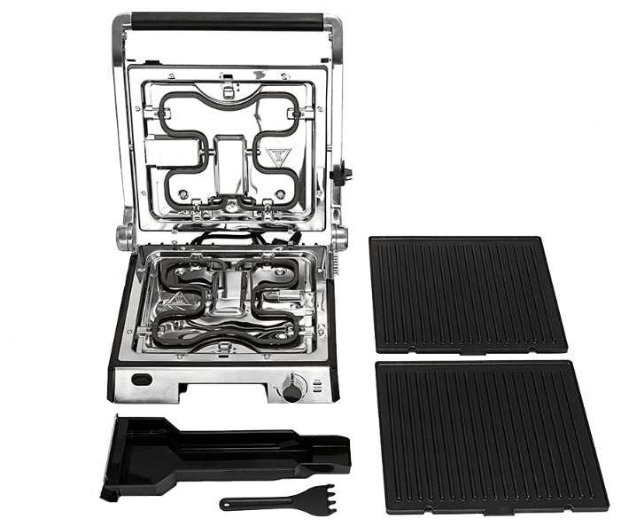 - Возможность использовать как контактный гриль, жаровню или тостер.