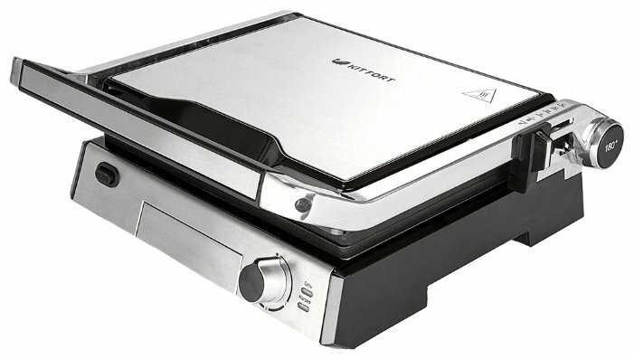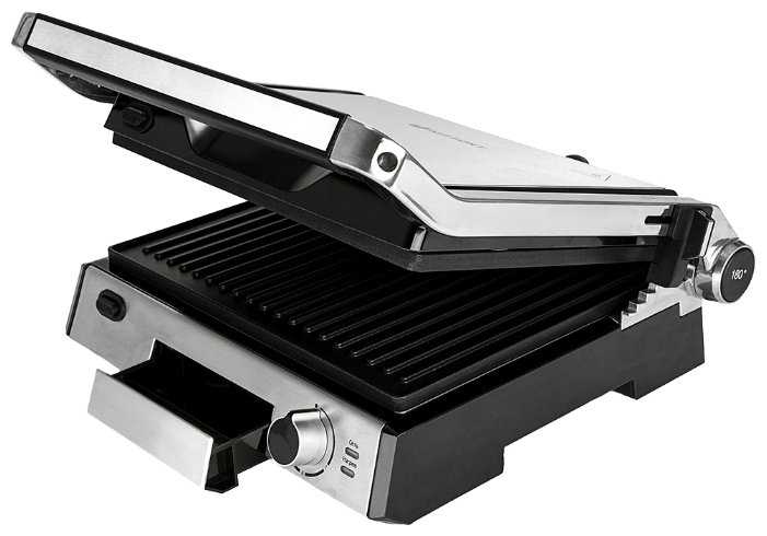 Крышка открывается на 180 градусов, и гриль можно использовать как плиту для жарки. - - В инструкции не хватает информации о специальных подножках для увеличения наклона гриля.