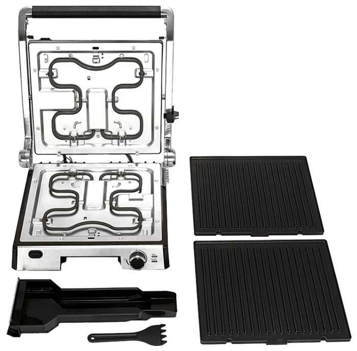 - + Легко и быстро снимаются панели, хорошо отмываются. Ручка удобная и в процессе готовки не нагревается, даже если долго пользоваться. Съемный лоток для сбора жира справляемся со своей задачей на отлично, никаких жирный капель на столе.