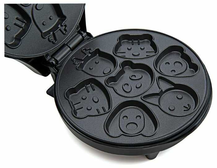 В общем брали для ребёнка, нагревается достаточно быстро, изначально был запах при нагрев но после он прошёл, кнопок вкл выкл нет вставил в розетку загорелись 2 индикатора и пошло поехало. Испробовали один рецепт вафлей, все получилось ничего не прилипло, единственное форму надо первую заполнять без горки ровную и тогда они красивые получаются 5-7 минут и готово. В целом брали из-за размера, её можно убрать на полочку и она не мешает, ребёнку понравилось, она начало поиграет формочками потом ест.