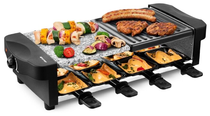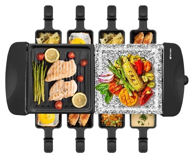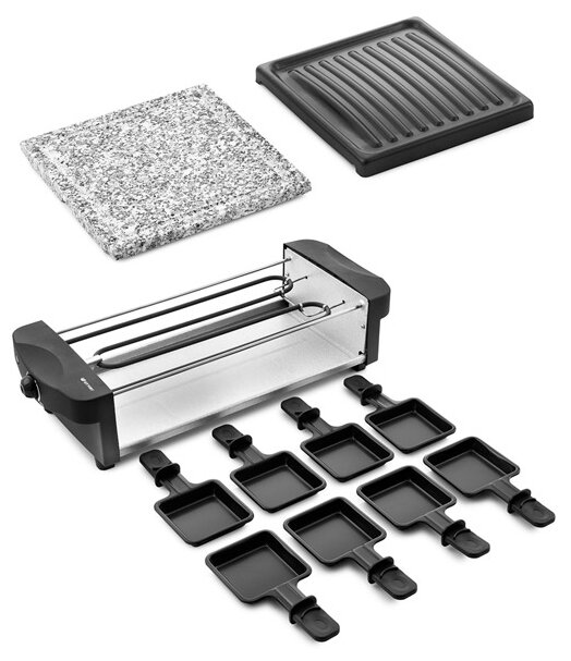 - - Короткий шнур, приходится использовать удлинитель, чтобы поставить раклетницу на обеденный стол. Отсутствуют небольшие лопаточки для переворачивания.
