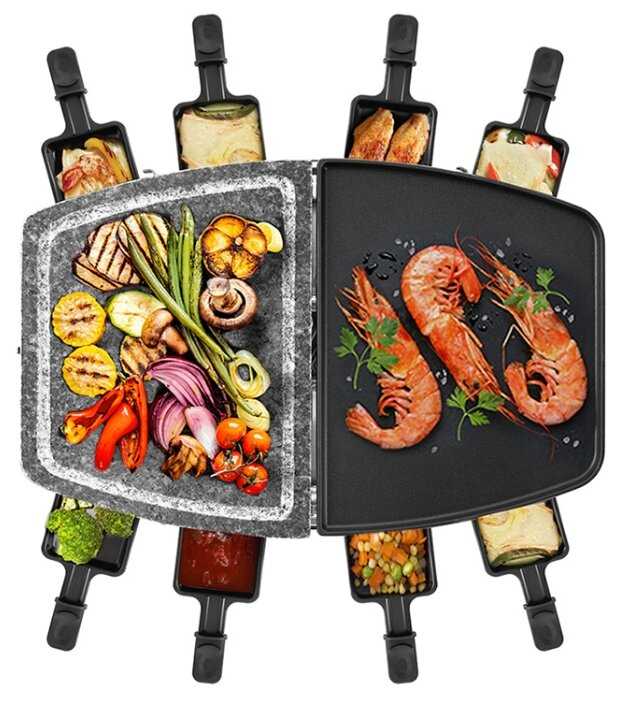 - + +1. С точки зрения технических характеристик: быстро нагревается и достаточно быстро остывает (кроме каменной поверхности, но это и понятно); легко моется (даже если что-то прилипнет, и поверхности и лопатки достаточно просто протереть чистой салфеткой; разнообразие рабочих поверхностей позволяет приготовить не только классику раклета, но и блинчики, яичницу, подогреть твердую пищу.