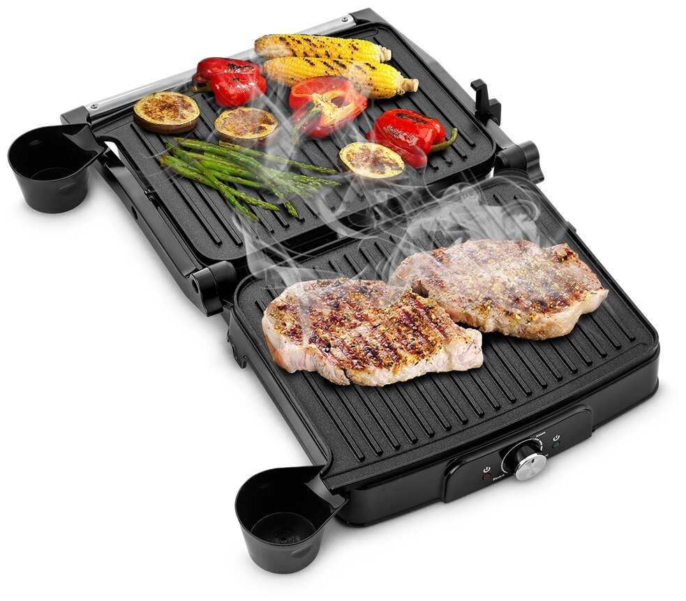 Конструкция с раскладыванием на 180° значительно расширяет возможности: можно одновременно жарить мясо и гарнир, что экономит время при готовке для семьи. Желобки для сбора жира и съемные стаканчики минимизируют уборку, хотя несъёмные панели усложняют глубокую очистку. Механическое управление (в отличие от сенсорного) повышает надежность, но отсутствие температурной маркировки на термостате требует привыкания — пользователи отмечают, что оптимальный режим находится методом проб.