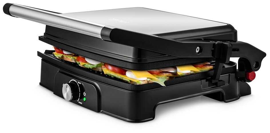 - Механизм фиксации крышки регулирует давление на продукты — от легкого прижима для бутербродов до плотного для стейков.