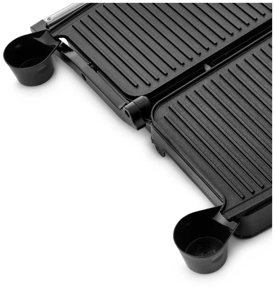 - + Отлично выглядит, качественная сборка, довольно большие антипригарные панели. Механическое управление спереди внизу, а не сенсоры на крышке, как у некоторых моделей. Раскладывается на 180°, что тоже может пригодиться (мне пока не понадобилось, впрочем). Отдельные стаканчики под жир и сок тоже в общем-то плюс - удобно мыть. И устойчивый в вертикальном положении - так хранить намного удобнее.