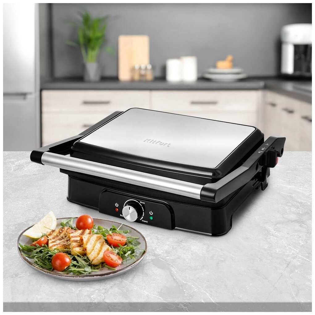 - + Быстрый нагрев, оптимальный размер панелей, простое управление, прекрасная прожарка мяса и овощей, раскладывающиеся на 180 градусов панели
