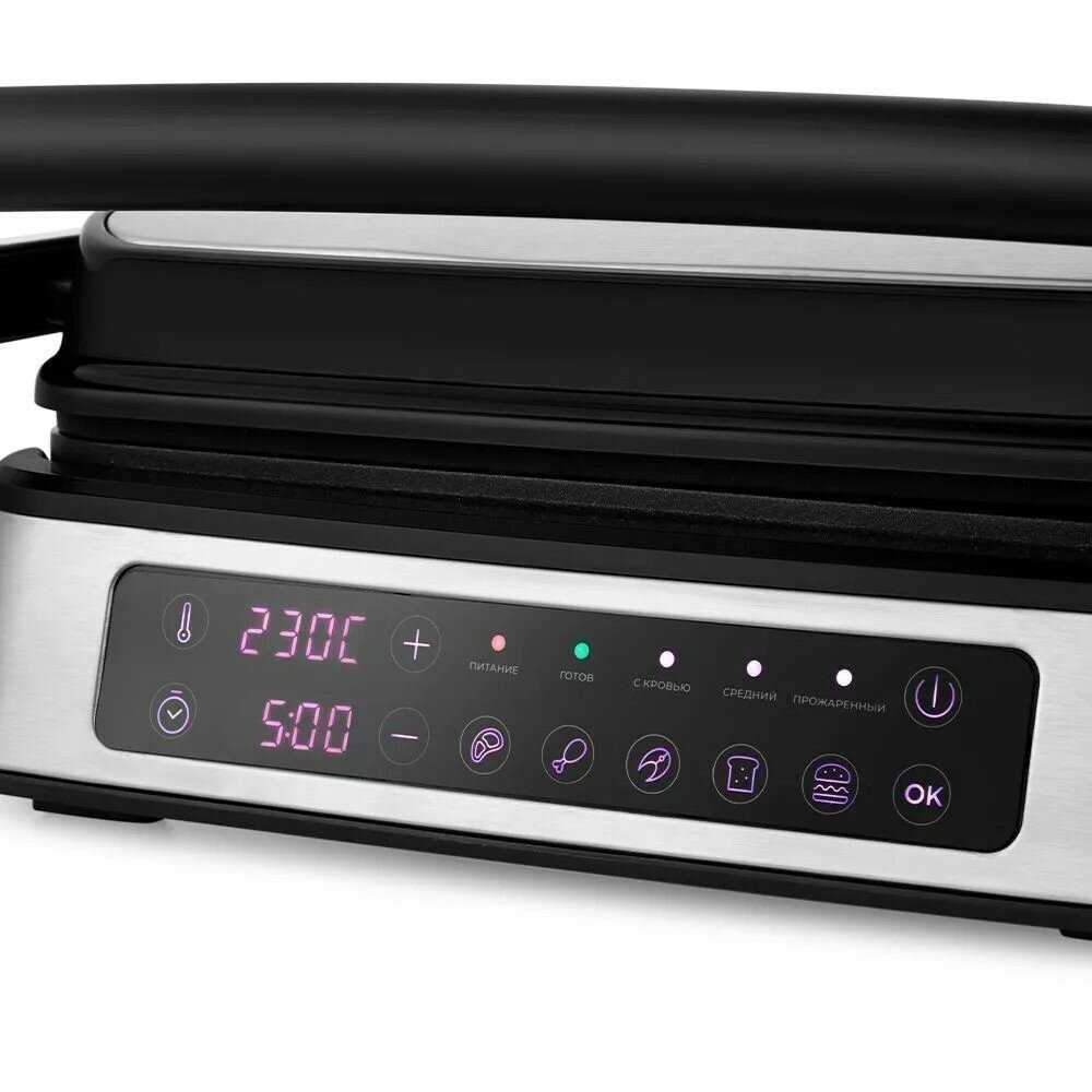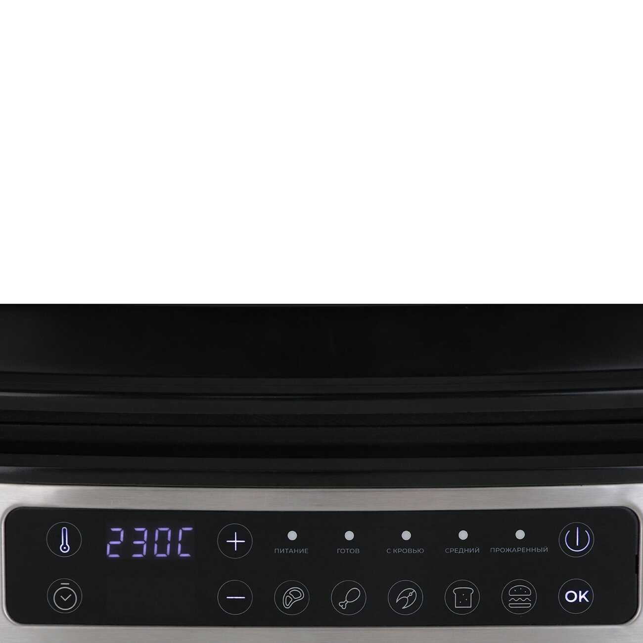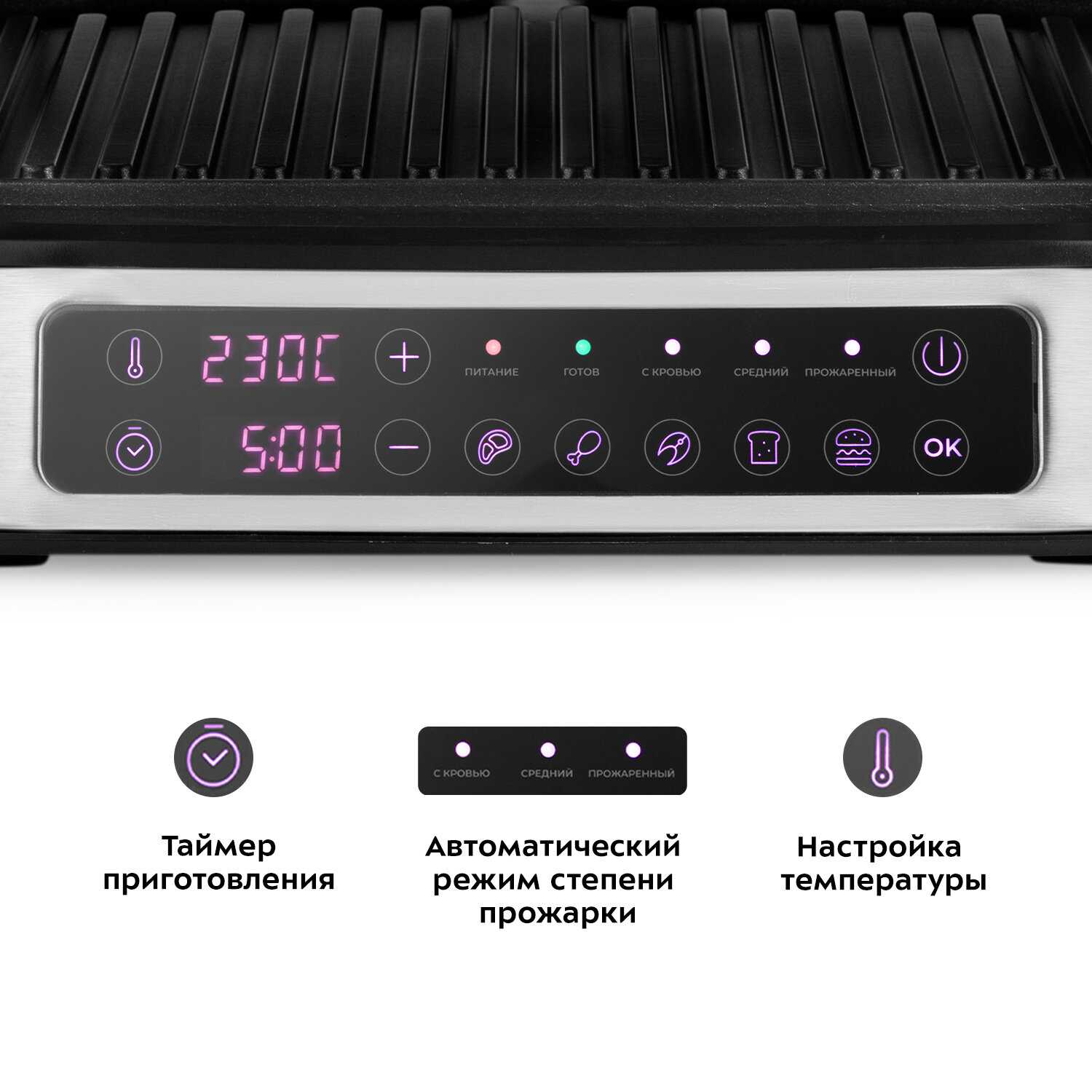 - 5 автоматических программ (мясо, рыба, бургеры, тосты, овощи) с точной терморегуляцией (до 230°C) и таймером отключения.