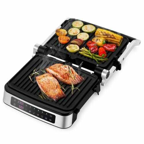 - Режим барбекю при раскладывании на 180° увеличивает рабочую поверхность вдвое для одновременного приготовления разнородных продуктов.