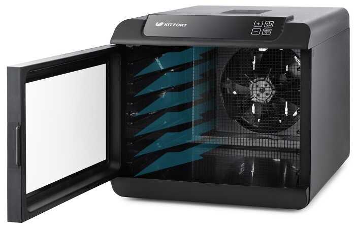 - Вентилятор расположен на задней стенке, обеспечивает равномерное распределение воздуха по всем 6 поддонам.